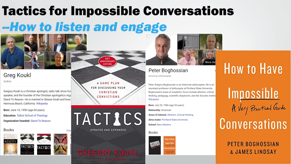 Peter Boghossian is the author of How to Have Impossible Conversations (with James Lindsay). Peter and James are interesting characters. Both think that religious folks “have a flawed epistemology” (way of knowing), but both are eager to engage in conversations with Christians and to discuss their differences in a friendly way.